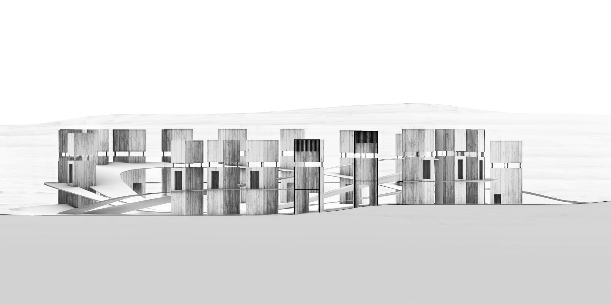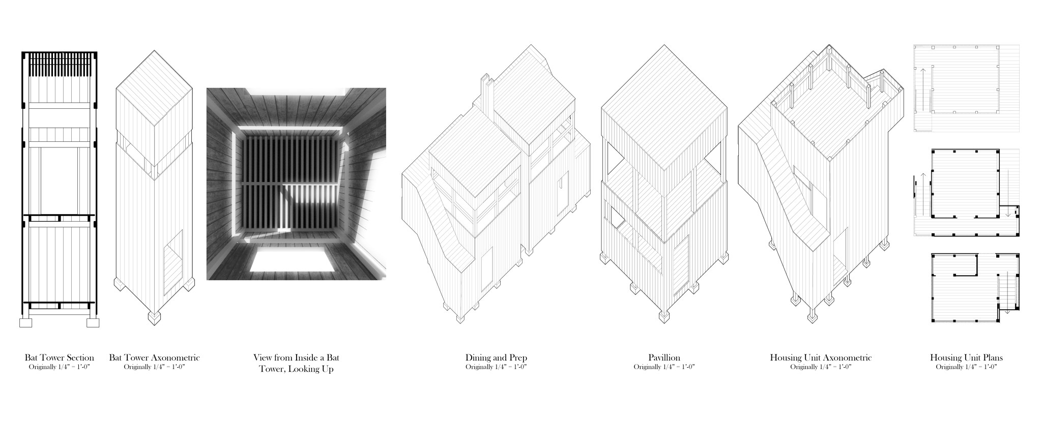 The community’s solution to the need for education, awarness, and reserach on bats is Cacibajagua, a bat conservatory housing researchers, conservationists, museum workers, and other staff. A family of architecture conceived from the original bat tower, dots through the rainforest along pre-existing pathways and along the tree lines. All buildings at 20 feet tall to mark the original contours of the land. These indexes of progress reflect the core value of the community which can be seen at the top of the hill at the sacred tower. Each year yields more progress to preservation and conservation, in terms of bats, their habitats, and our environment, and can be visually seen and understood through archtiecture.