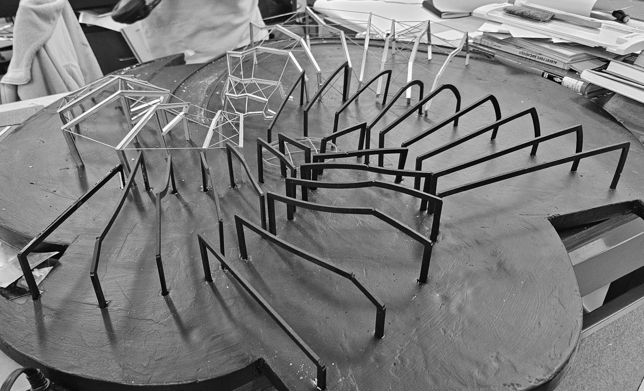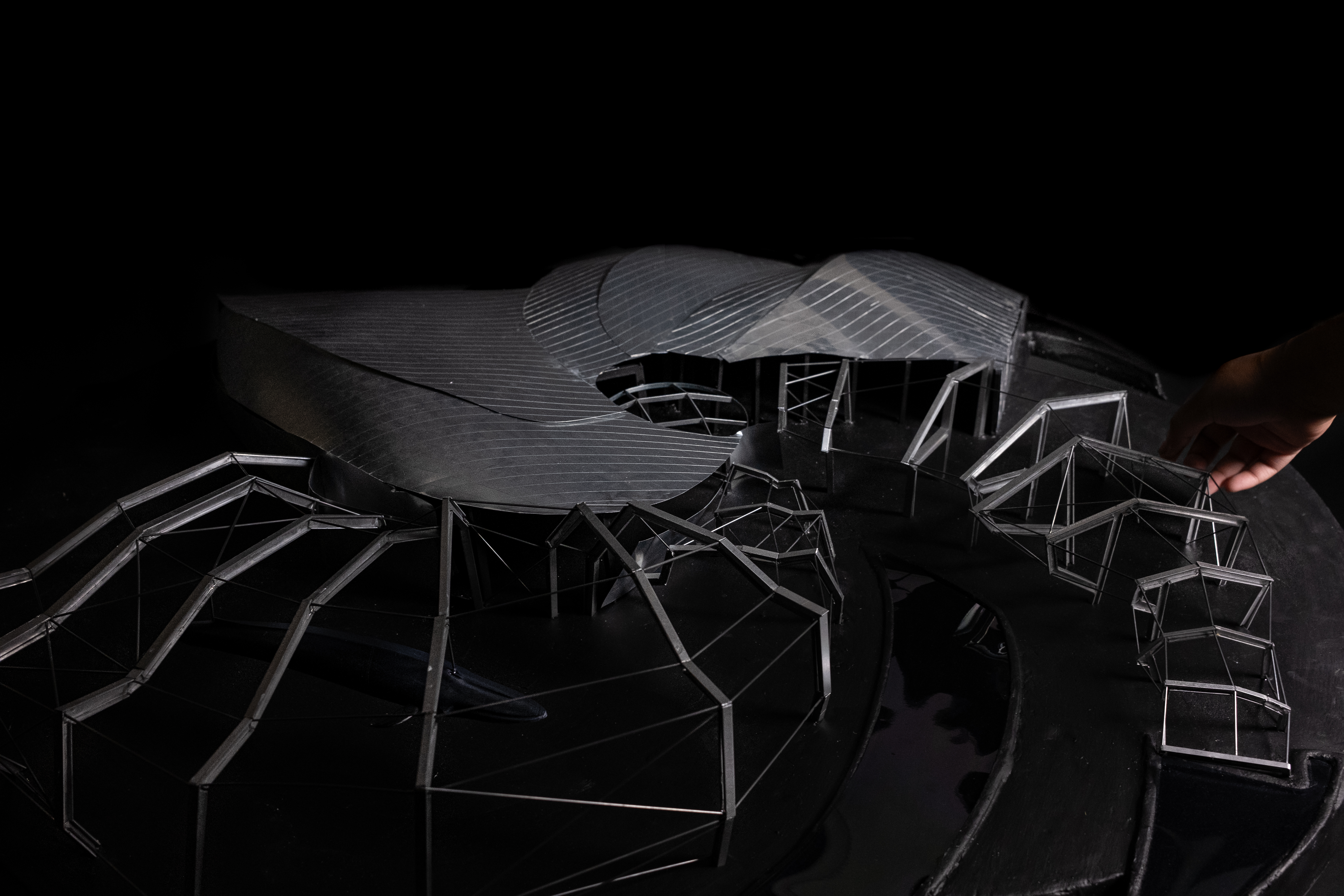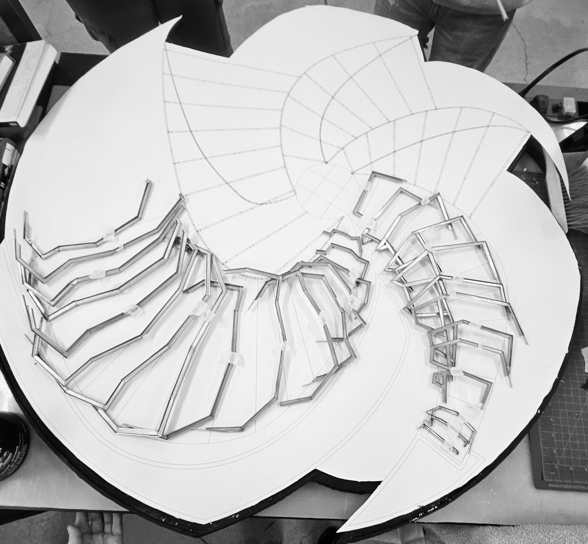 The physical model clarified relationships that drawings alone could not. Small shifts in frame geometry produced outsized spatial and structural effects, revealing how local differences accumulate into a coherent spiral. Modeling became a way to test how precision, rather than smoothness, generates fluid form.