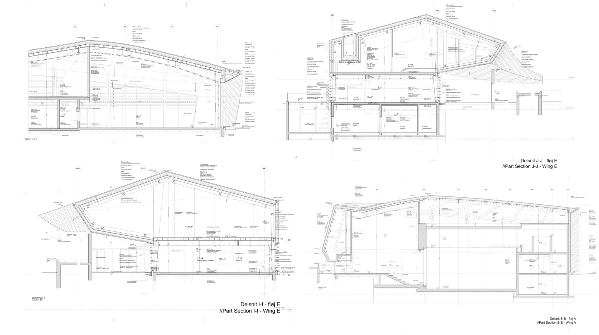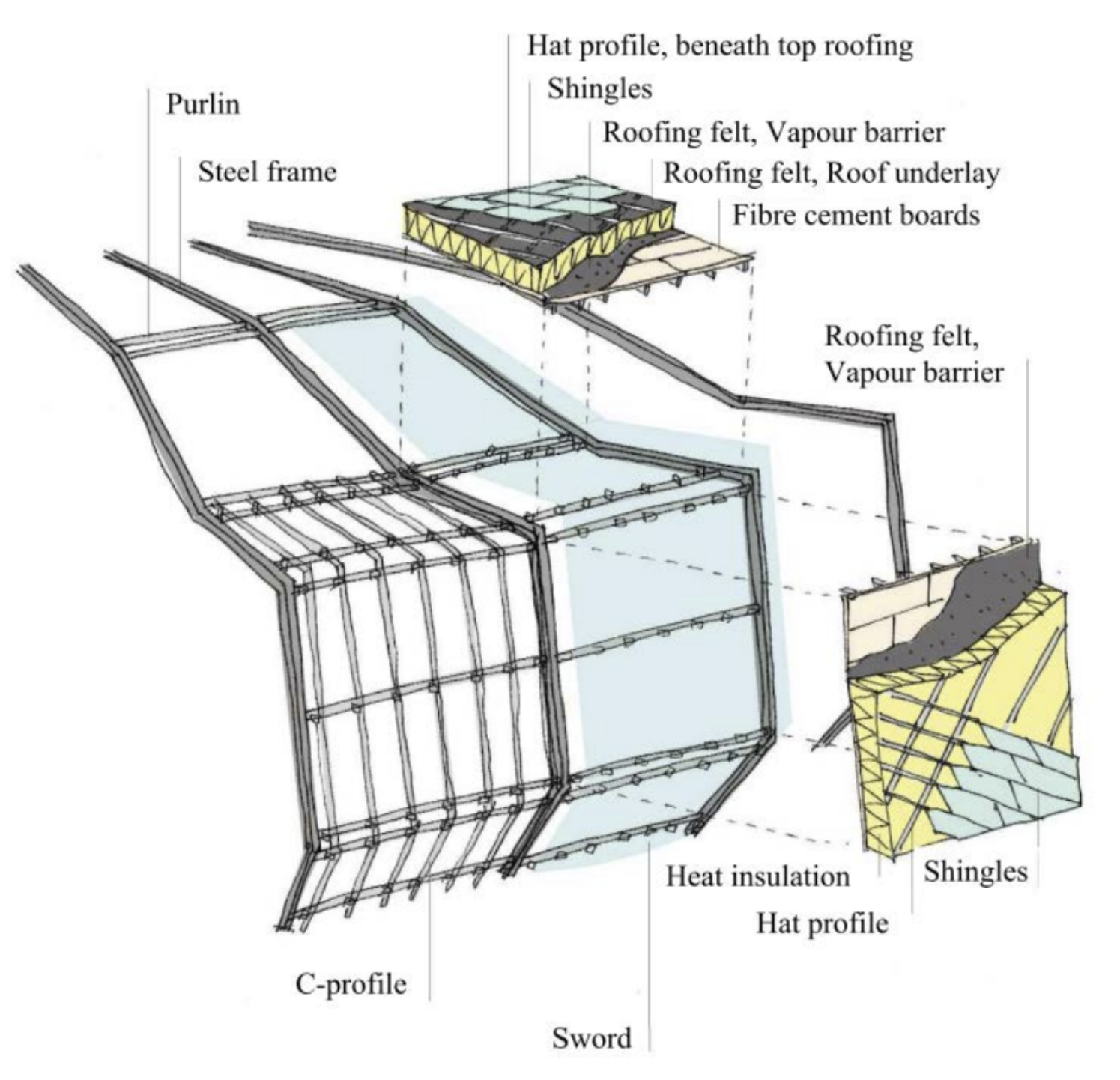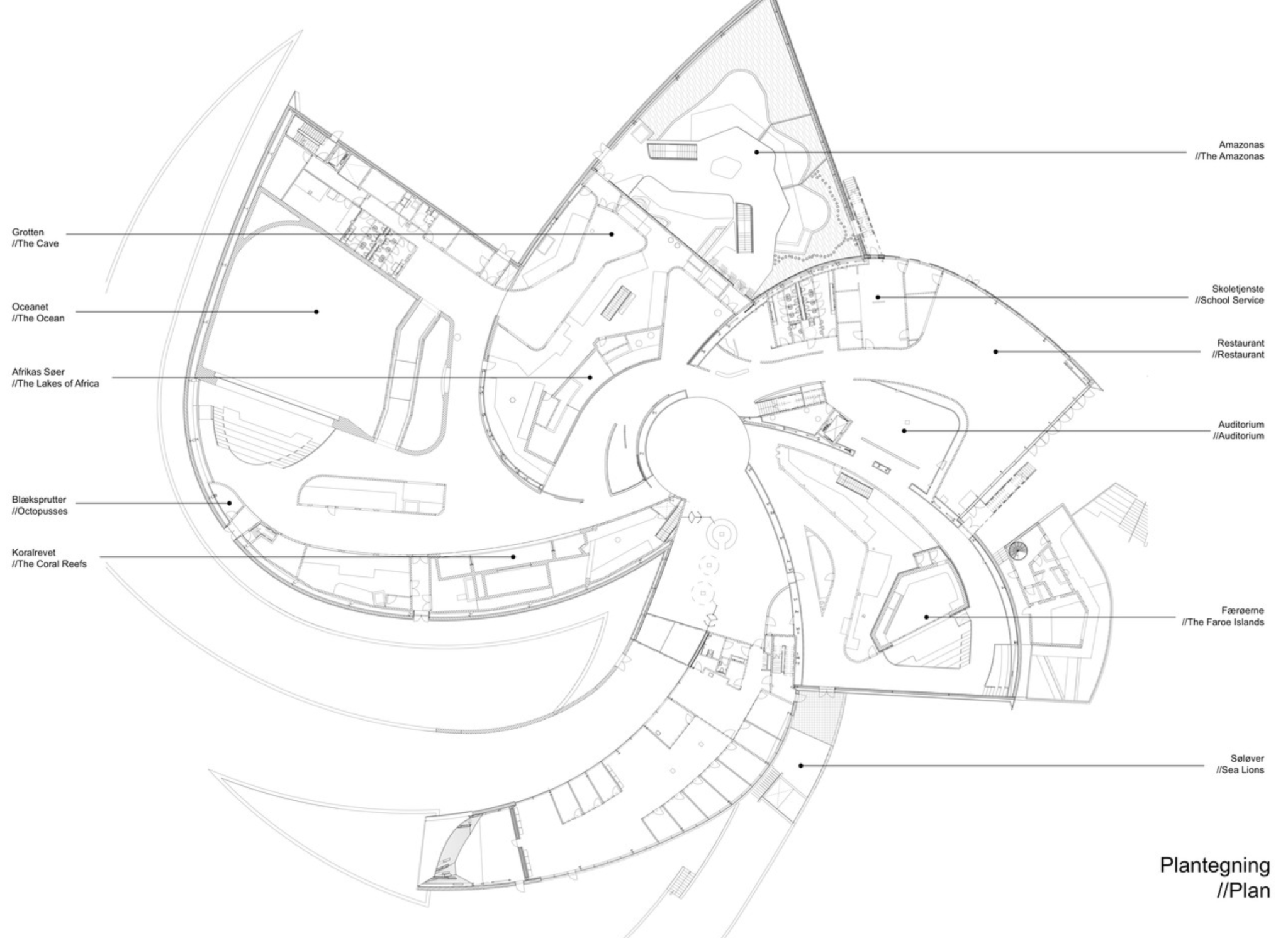 Den Blå Planet operates as a field of rigid steel frames rather than a continuous shell. Each frame shares a common radial center yet varies in depth, span, and pitch, allowing curvature to emerge through repetition rather than bending. Cross-bracing and purlins stabilize the system, transforming geometric variation into structural performance.
